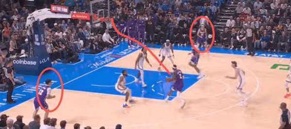 当范德比尔特上场时,在45度角夹击东契奇 范德比尔特直接下顺 外线并没有接应点 拉拉维亚也没有向上线移动 再加上切特和卡鲁索的防守 直接导致失误