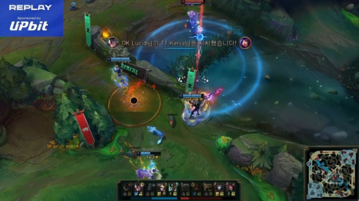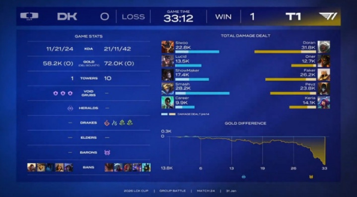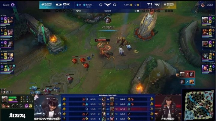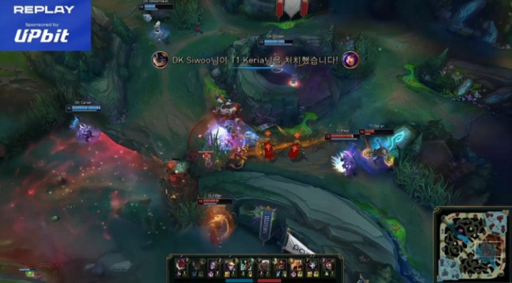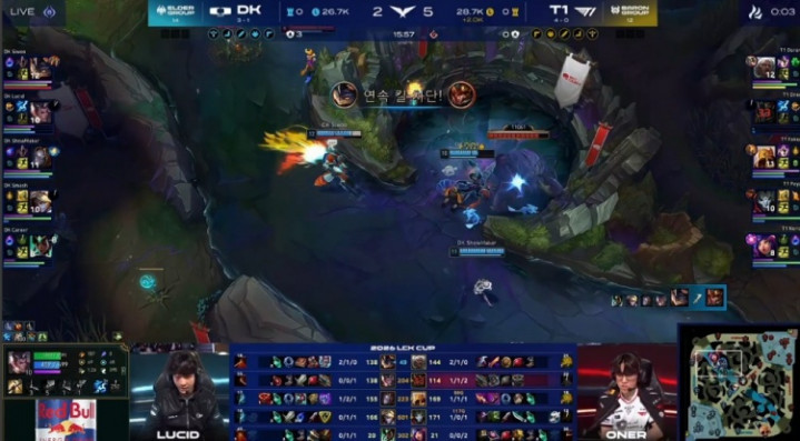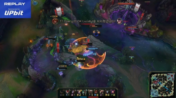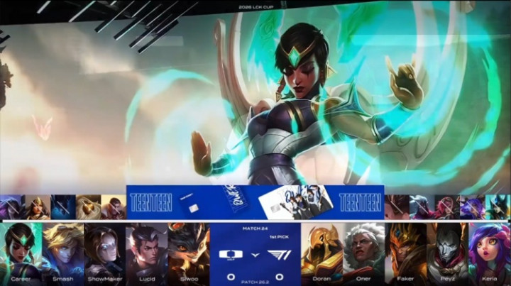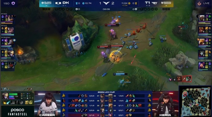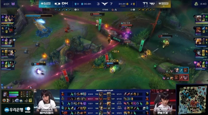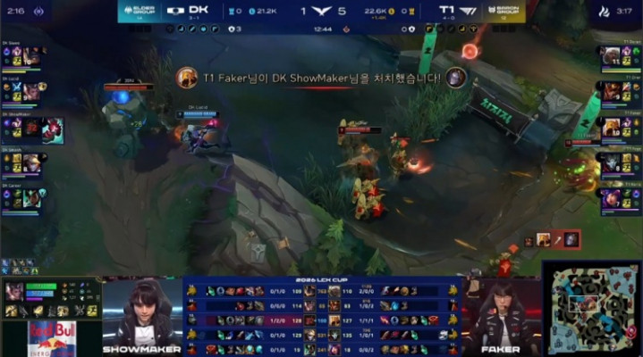 第一局前期,Oner皇子中路换掉ShowMaker发条,随后下路配合Peyz烬与Keria妮蔻越塔击杀Career卡尔玛和Smash伊泽瑞尔,Doran安蓓萨线上与Siwoo兰博相互单杀,T1取得1.7k领先。