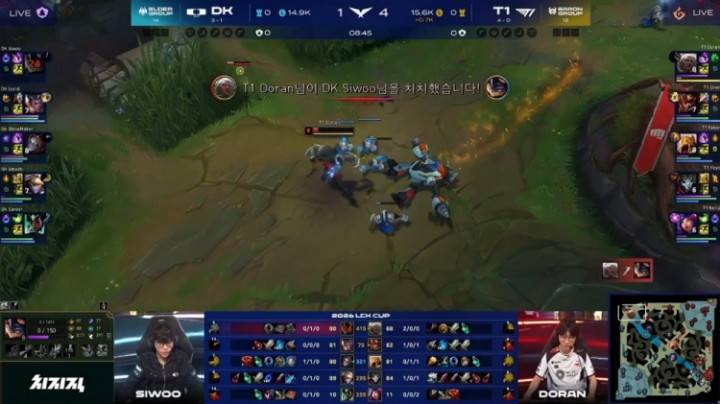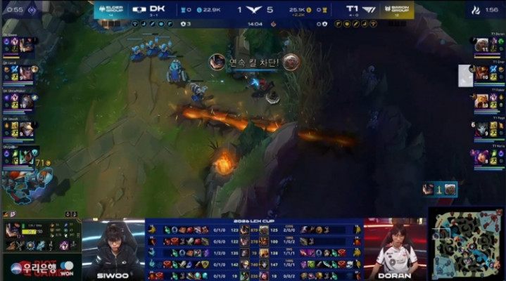 中期双方围绕先锋与小龙多次交换人头,Faker沙皇与Doran安蓓萨联动在上路击杀Siwoo兰博,T1保持2.7k优势,DK借先锋追回部分经济。
