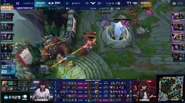 后期T1拿到炼金龙魂并在大龙处击杀DK三人,经济领先超过1W,随后推进中下,Peyz烬连续收割,T1推平DK基地先下一城。